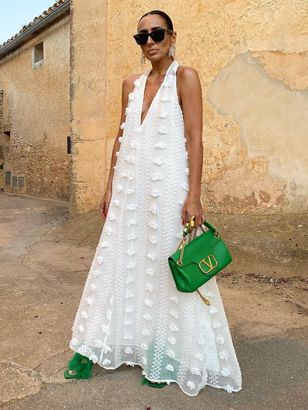 The Aria Three-Dimensional Floral Halter Maxi Dress blends sculptural texture with graceful movement. Ideal for special occasions and destination events, this piece brings layered floral accents and a flowing silhouette together in a striking, feminine form.